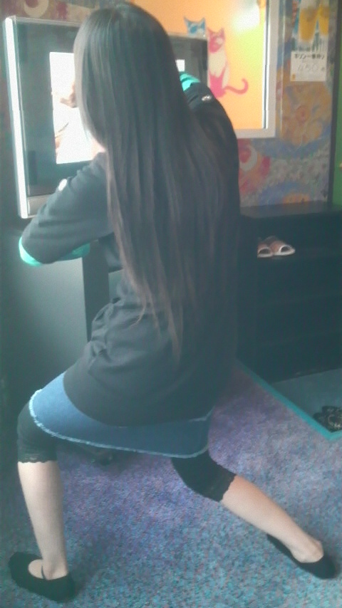 先っぽの部分は腰まで達している長くに長くなった髪の毛は髪型だけ“ファイナルファンタジー7”のティファの髪型を先細りにして、そのまま伸ばしたような形です。(前髪は癖毛のせいで勝手にティファとは逆側に分かれていますが)