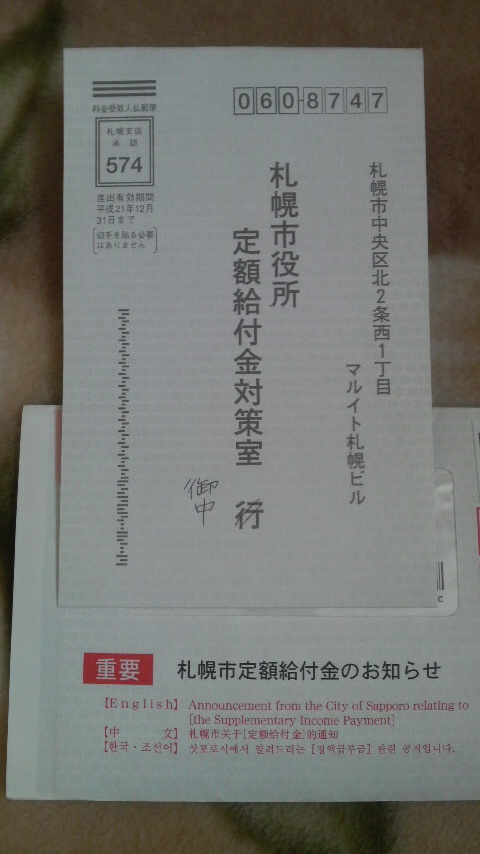 先週、我が家にも定額給付金の申請書が届きました。必要事項を記入して、通帳のコピーも添付して返送しましたが、不備は無かったかな?(汗)
