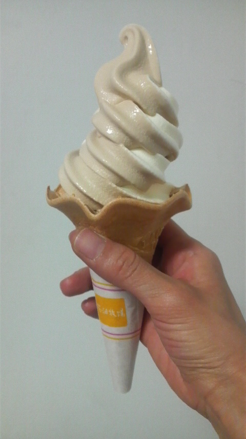 これは生キャラメルとミルクのミックスで、他に生キャラメルだけの味とミルク味のみのソフトクリームがあります。