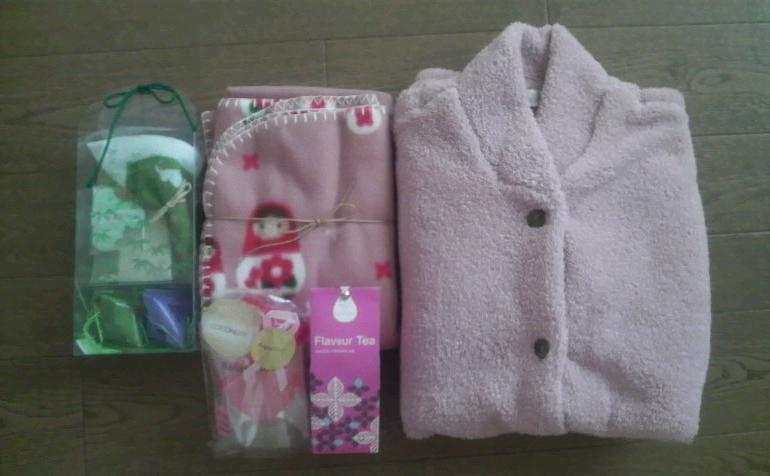 一人は触り心地抜群で裏地がフリースになっている上着、一人は同じくフリースの膝掛け、一人は入浴剤、バスソルト等を詰め合わせたお風呂セット、一人はアロママッサージグッズとフレーバーティー。