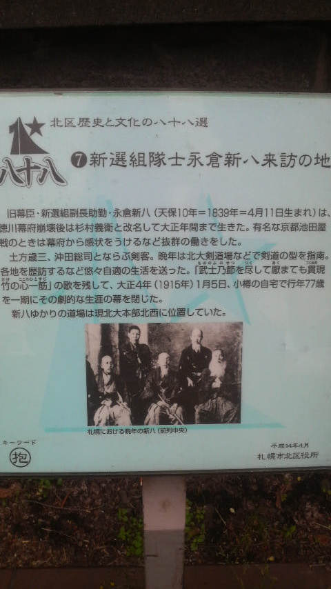 また一週間後に診察の予約を入れて、ぽてぽてと北大通り(樽川通り)を歩いていたら、北海道大学正門のほぼ真横にある『北区歴史と文化の八十八選』のひとつ、『新撰組隊士 永倉新八来訪の地』の碑を通り掛かりました。