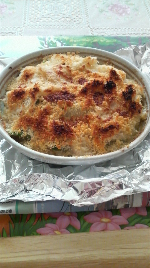 ちなみに実家のグラタン、ドリア系はホワイトソースの上にパン粉とたっぷりのパルメザンチーズを載せた上にバター片を幾つか散らして焼いた、表面カリカリのタイプ。